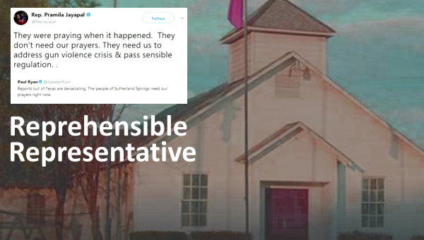 What is inappropriate is mocking the very beliefs the victims find comfort in. I do not talk a lot of politics on this site largely because politicians do not influence our lives as much as God does when we devote ourselves to him. I’m making one small exception today as I believe such haughtiness and self-righteousness as demonstrated by Representative Pramila Jayapal ought to be considered and remembered as the worst kind of example. On the social media site Twitter, she responded to Representative Paul Ryan’s comment “The people of Sutherland Springs need our prayers right now” with this thoughtless post:
